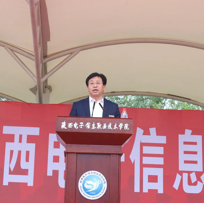 9月4日下午,陕西电子信息职业技术学院校园内彩旗飘扬、气氛庄重,2025 级新生军训动员大会在运动场召开。理事长、院长王明星出席会议并讲话,党委书记石光华为军训团授旗。军训团长杨丽森,党委副书记、副院长年小望,党委副书记、纪委书记马放奇等院领导参会,会议由军训团政委、副院长李泽宇主持。