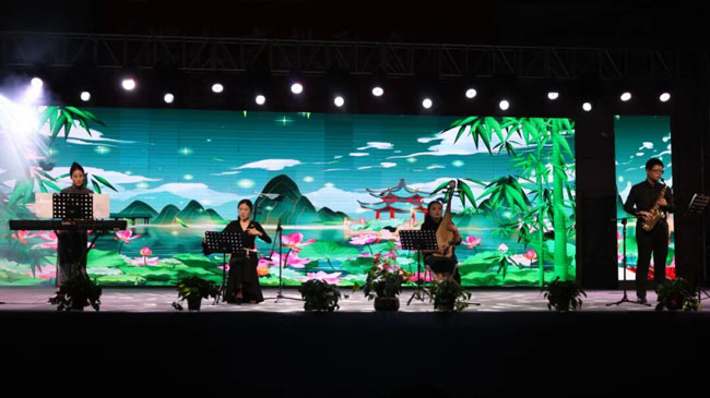 “度中秋”篇章浸润着传统文化的温柔。独唱《大地飞歌》的旋律中,壮族风情的曲调婉转悠扬,演唱者手持折扇,歌声里满是 “踏平了山路唱山歌” 的洒脱,台下学子跟着节奏轻轻摇晃身体;乐器合奏《兰亭序》更显雅致,古筝的清越、二胡的悠扬、琵琶的清脆交织在一起,舞台背景屏上缓缓展开《兰亭集序》的书法长卷,墨色的“之”字与音符共舞,不少学子拿出手机记录这美好瞬间,传统文化的韵味在夜色中静静流淌。