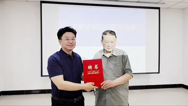 报告会上,赵永泰教授凭借渊博学识和独到见解,围绕中美贸易的现状、挑战与机遇展开全面剖析。报告中,详实的数据与宏观的战略视野相结合,深入浅出的讲解让师生们对中美贸易这一重要议题有了更深刻、更全面的认识。报告结束后,现场进入互动环节,同学们踊跃提问,赵教授耐心解答,学术交流氛围热烈。随后,在报告会现场举行了客座教授聘任仪式,由学院理事长王明星为赵永泰教授颁发聘书,聘任其为学校客座教授,现场师生以热烈掌声向赵教授表示祝贺。