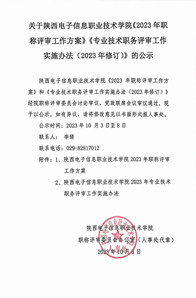 关于陕西电子信息职业技术学院《2023年职称评审工作方案》《专业技术职务评审工作实施办法...》公示
