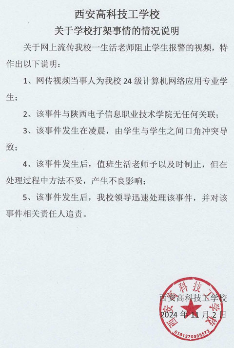 转发“西安高科技工学校关于学校打架事情的情况说明”