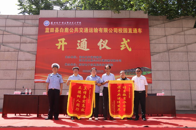 黄亚玲宣布校园公交车正式开通。学院向蓝田县交通运输局和白鹿公共交通运输有限公司赠送了锦旗。