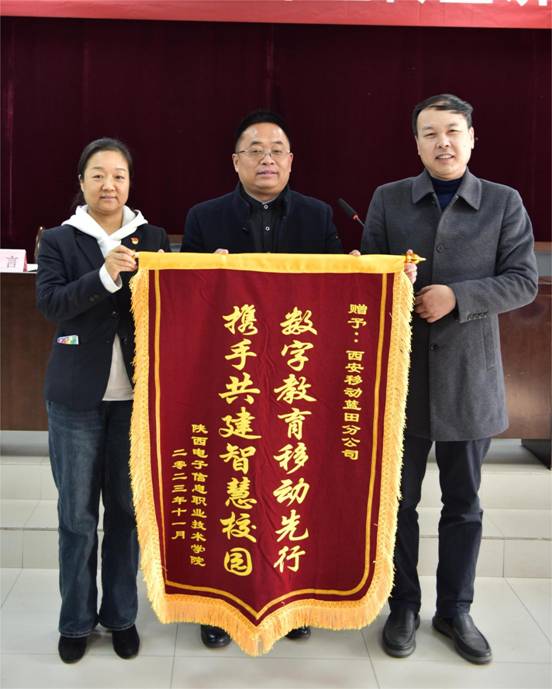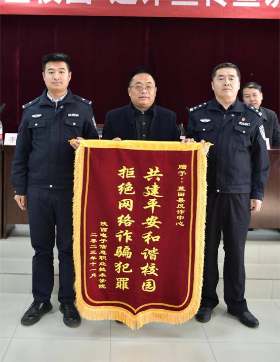 11月22日,蓝田县反诈中心队长李权、蓝田县移动公司总经理侯小波一行五人来到我院,为师生作了预防电信诈骗和正确使用智慧校园网的主题宣讲,受到师生热烈欢迎。党委委员、副院长李泽宇代表学院对他们的到来表示欢迎,并分别为蓝田县公安局、蓝田县移动公司颁发锦旗,对他们积极进行反诈宣传给予感谢。