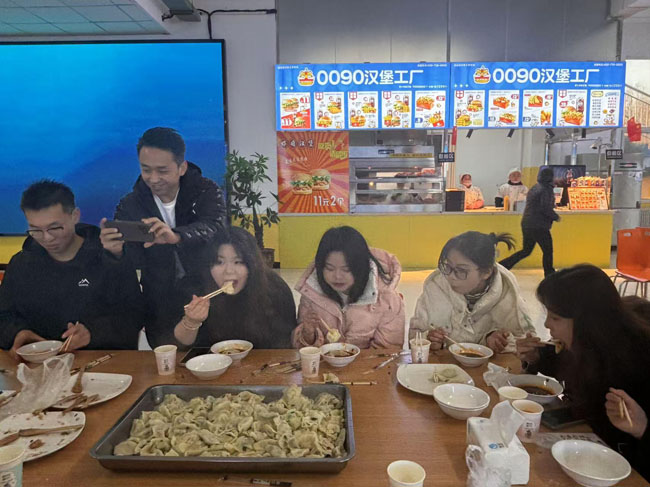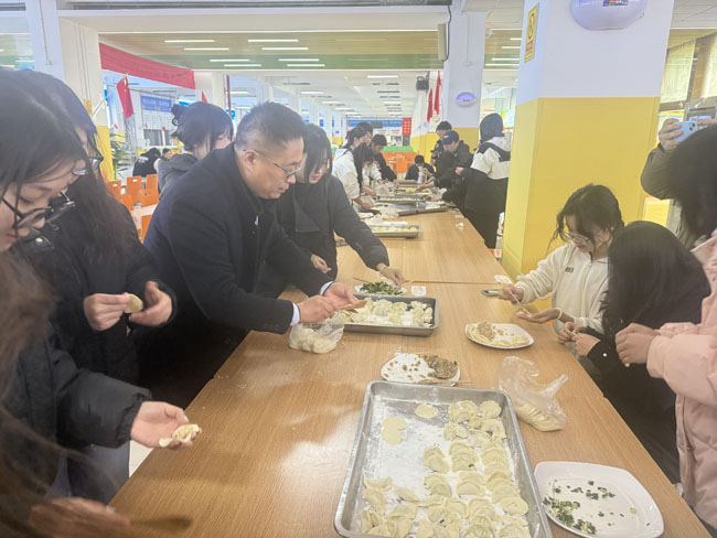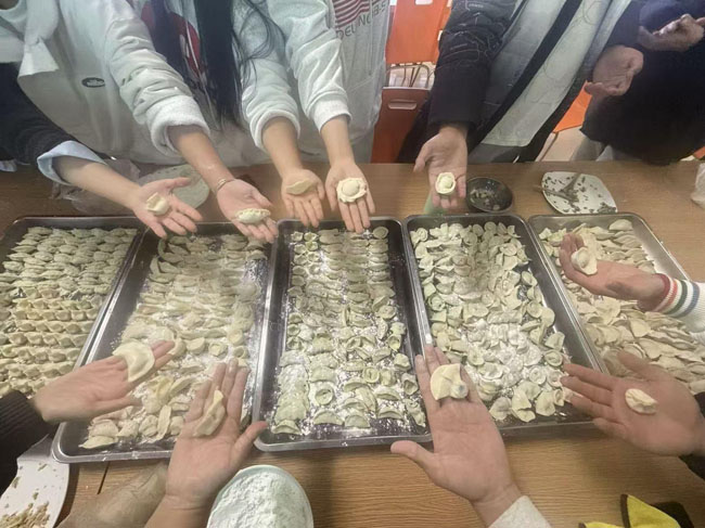 体验劳动的快乐,品味饺子的鲜美。餐饮中心工作人员为老师和同学们准备了新鲜的饺子皮和馅料,同学们亲手捏出一个个各具特色的饺子。不同地域的同学分享包饺子的技巧,交流吃饺子习俗。