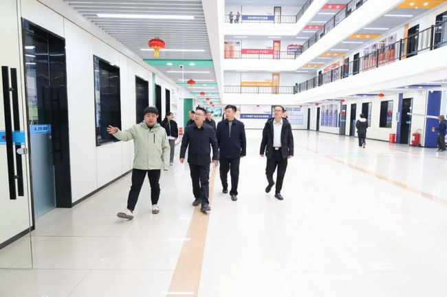 随后,刘学政一行深入校园进行走访调研。春日的校园里,杨柳吐绿,樱花含苞待放,一派生机勃勃的景象。调研组先后参观了学院的人工智能实训中心、校企合作基地以及学生创新创业成果展厅。在现代化教学楼与实训室内,师生们专注地操作着智能化设备,展现出浓厚的学习氛围和良好的教学风貌。