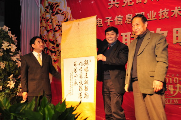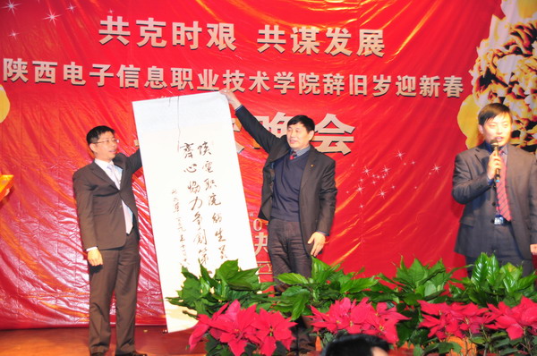 院长邢永华以“共克时艰,共谋发展”的重要讲话拉开了本次晚会的序幕,他全面总结了我院办学18年来所取得的成绩以及面临的挑战,讲话内容真实,鼓舞人心,不时迎来台下全场师生的阵阵掌声。学院董事会、省教育厅和杨凌示范区管委会为学院赠送了字画“鲲鹏展翅翱翔九天 虎跃龙腾福泽四海”“陕电职院 师生员工 同心协力 争创第一”以表庆贺。同时,学院征集的新校徽在省教育厅石光华处长和莱佛士教育集团中国区总裁周国础先生的共同揭幕下,终于揭开其神秘面纱闪亮登场,预示着学院在新的一年里,必将以崭新的面貌迈向更加辉煌的发展征程。