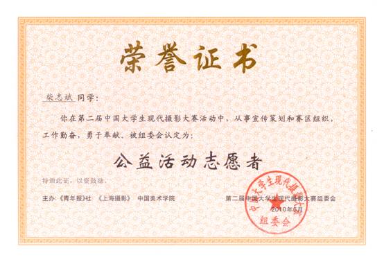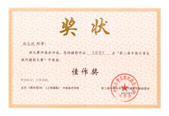 热烈恭贺我院08级计算机系柴志斌同学荣获第二届中国大学生现代摄影大赛佳作奖