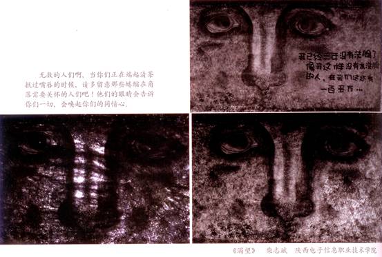 本作品是作者在一次路行中有幸遇见所拍。作品来源本是一个板报,将板报进行翻拍本来是摄影中的禁忌,因为它本来就是一件“死”东西,重新将它拍摄更是静上加静,很难表现出作品的意境和动态之感。然而此作品却荣获第二届“龙腾镜头”中国大学生现代摄影大赛佳作奖。其原因有三:第一,作品主题比较好,作者借原作品 “我已三年没有洗脸了,像我这样的孩子在我们那里还三十多万”的诠释,给作品命名,也正是此诠释勾起作者拍摄之灵感,从而起名为“渴望”。而画面经过作者修剪以后,虽然面无表情,但两只炯炯有神的眼睛里表达出一种渴望的心声,一种正常生活的向往。第二是拍摄技巧,也为作品的艺术体现之处,是真正能表现摄影艺术的部分。作者拍摄之时正是下午黄昏,夕阳斜下,一束美丽的夕阳之光透过树影沐浴于树下的板报,板报之上的面相上随即出现一道道光痕,作者捉住瞬间,按下镜头。于是一副普通的板报却成了一件真正意义上的摄影作品,真所谓摄影真谛就在于能否扑捉瞬间,局部依然可以涵盖整体。虽然整个作品画面简单而又色单,但几道光痕的映衬下作品显得富有拍摄难度和艺术之感。第三,本次大赛总共涉及全国各省市很多高校(包括港台地区),其中有好一部分参赛作品是摄影专业院校学生所拍,一万多幅参赛作品,作者能有成为陕西参赛选手中仅有两名获奖作者之一,主要还有作者选择的类别恰到好处,本次大赛设艺术、纪实、观念三种类别的作品,而作者选择观念表达类也是作品获奖有利之处。