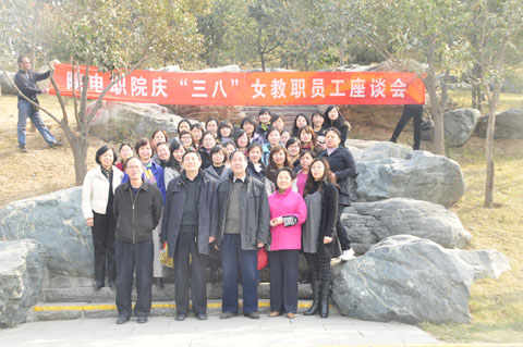 2011年3月8日13:00,院常务副院长邢永华、副党委书记武玉光和院工会主席兼院办公室主任杨瑞卿与所有女教职员工在一楼会议室召开“三八”座谈会,会上院领导向全体女同胞、女性、美女致以节日的祝贺,祝贺大家越来越美丽、越来越洋气。同时,感谢大家对学院建设与发展做出的贡献,也希望大家为了学院的未来和发展诚信协作,以创新的思维和方法迎接更加美好的明天。14:00整,大家坐上校车直奔南湖,一路上欢声笑语、喜气洋洋,好一派热闹的景象。唐城曲池、江滩叠水、柳堤春晓、湖心仙岛处处留下陕电职院和谐的脚步。最后,大家在南湖边合影留下美好的记忆。